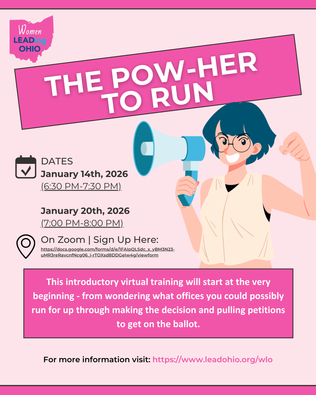 Women LEADing Ohio invites you to join us on Wednesday, January 14, 2026, or on Tuesday, January 20, 2026, for our first two Pow-Her to Run Sessions of the year. This virtual training will cover everything from deciding which office to run for to pulling petitions to get on the ballot, while also emphasizing the importance of increasing female representation in Ohio’s government.